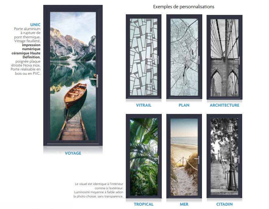 Une porte aluminium à rupture de pont thermique, vitrage feuilleté, impression numérique céramique haute définition, poignée plaque étroite Nova inoxydable.